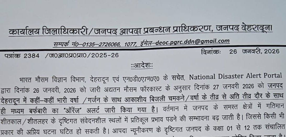 भारत मौसम विज्ञान विभाग, देहरादून एवं एन०डी०एम०ए० के सचेत, National Disaster Alert Portal द्वारा दिनांक 26 जनवरी, 2026 को जारी अद्यतन मौसम फॉरकास्ट के अनुसार दिनांक 27 जनवरी 2026 को जनपद देहरादून में कहीं-कहीं भारी वर्षा / गर्जन के साथ आकाशीय बिजली चमकने / वर्षा के तीव्र से अति तीव्र दौर के साथ ही मध्यम बर्फबारी का ‘ऑरेंज’ अलर्ट जारी किया गया है।