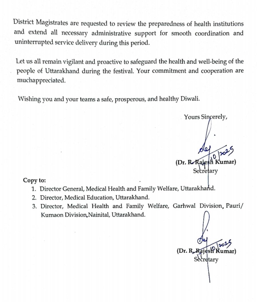 स्वास्थ्य सचिव डॉ. आर. राजेश कुमार ने स्पष्ट किया कि विभाग का उद्देश्य केवल उपचार देना नहीं, बल्कि समय पर राहत और रोकथाम सुनिश्चित करना भी है। उन्होंने कहा कि दीपावली और इगास पर्व के दौरान विभाग पूरी तत्परता से कार्य करेगा ताकि किसी भी आपात स्थिति में त्वरित सहायता उपलब्ध हो सके। उत्तराखंड स्वास्थ्य विभाग ने सभी नागरिकों से अपील की है कि वे पर्वों की खुशियाँ जिम्मेदारी के साथ मनाएँ, दूसरों की सुरक्षा का भी ध्यान रखें और किसी भी आपात स्थिति में तुरंत मदद के लिए संपर्क करें।