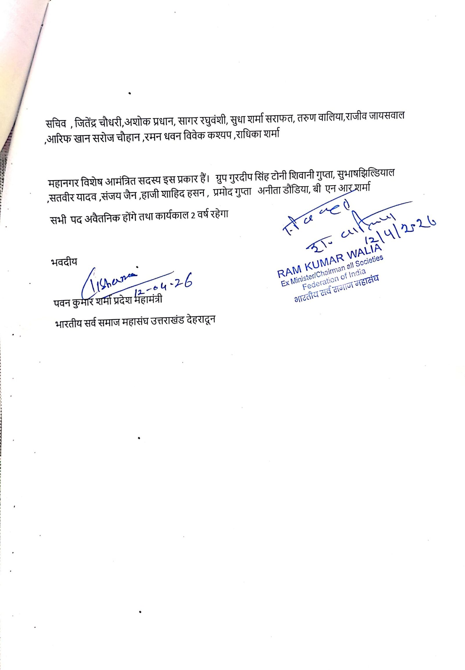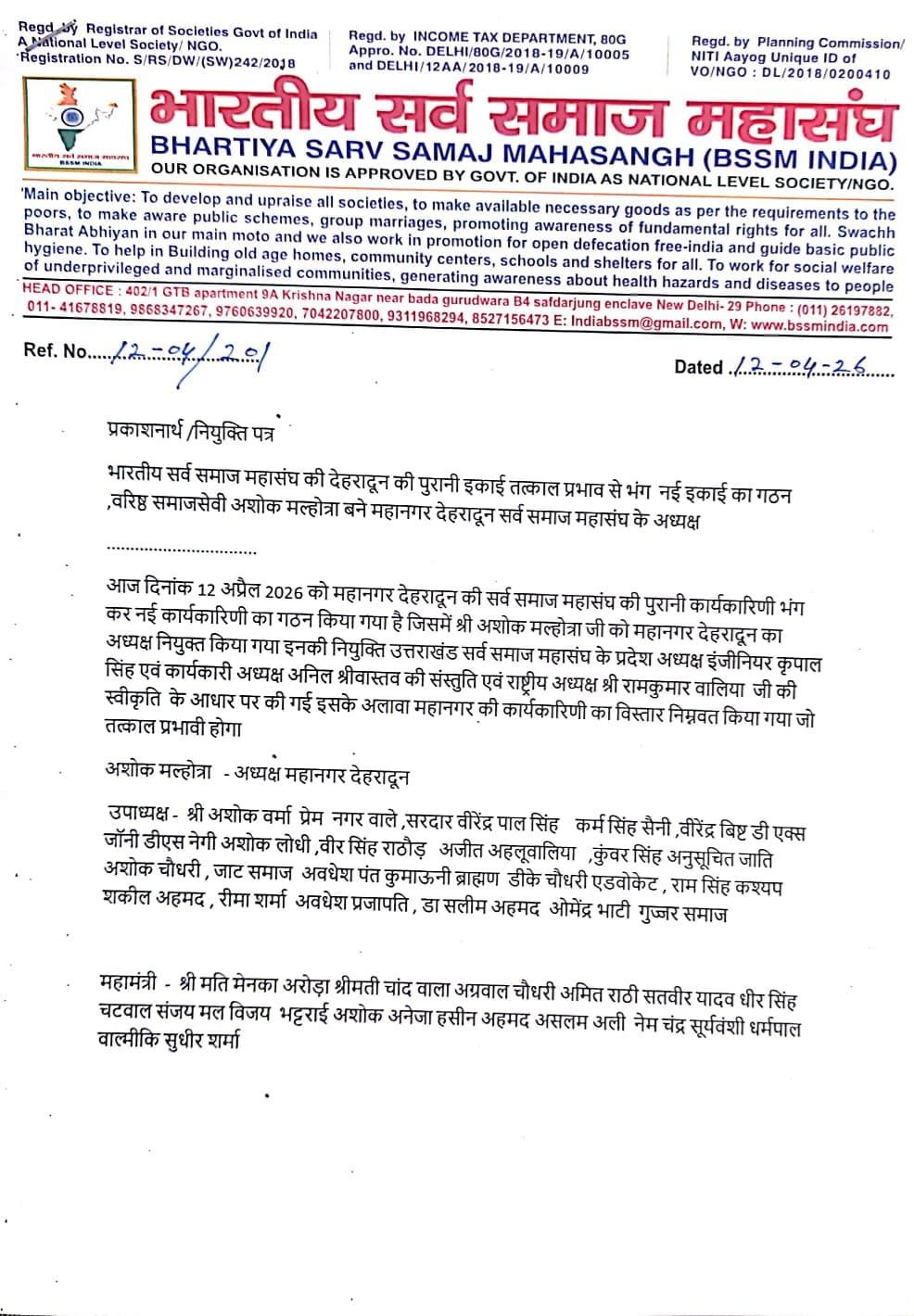 - दिनांक 12 अप्रैल 2026 को महानगर देहरादून की सर्व समाज महासंघ की पुरानी कार्यकारिणी भंग कर नई कार्यकारिणी का गठन किया गया है जिसमें अशोक मल्होत्रा को महानगर देहरादून का अध्यक्ष नियुक्त किया गया इनकी नियुक्ति उत्तराखंड सर्व समाज महासंघ के प्रदेश अध्यक्ष इंजीनियर कृपाल सिंह एवं कार्यकारी अध्यक्ष अनिल श्रीवास्तव की संस्तुति एवं राष्ट्रीय अध्यक्ष श्री रामकुमार वालिया की स्वीकृति के आधार पर की गई इसके अलावा महानगर की कार्यकारिणी का विस्तार निम्नवत किया गया जो तत्काल प्रभावी होगा