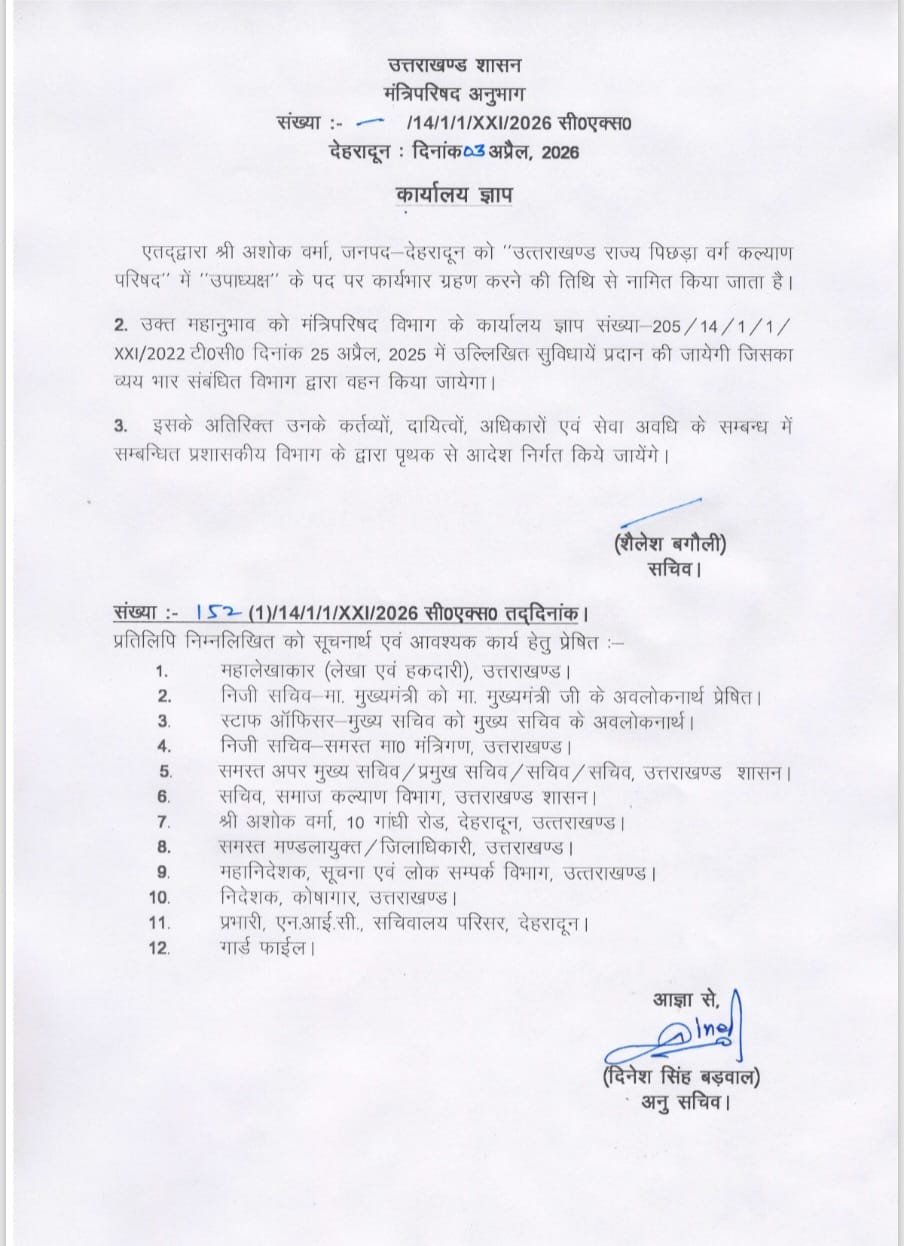देहरादून: उत्तराखंड शासन के मंत्रिपरिषद अनुभाग द्वारा जारी कार्यालय ज्ञाप के अनुसार देहरादून जनपद निवासी अशोक वर्मा को उत्तराखंड राज्य पिछड़ा वर्ग कल्याण परिषद में उपाध्यक्ष पद पर कार्यभार ग्रहण करने की तिथि से नामित किया गया है।