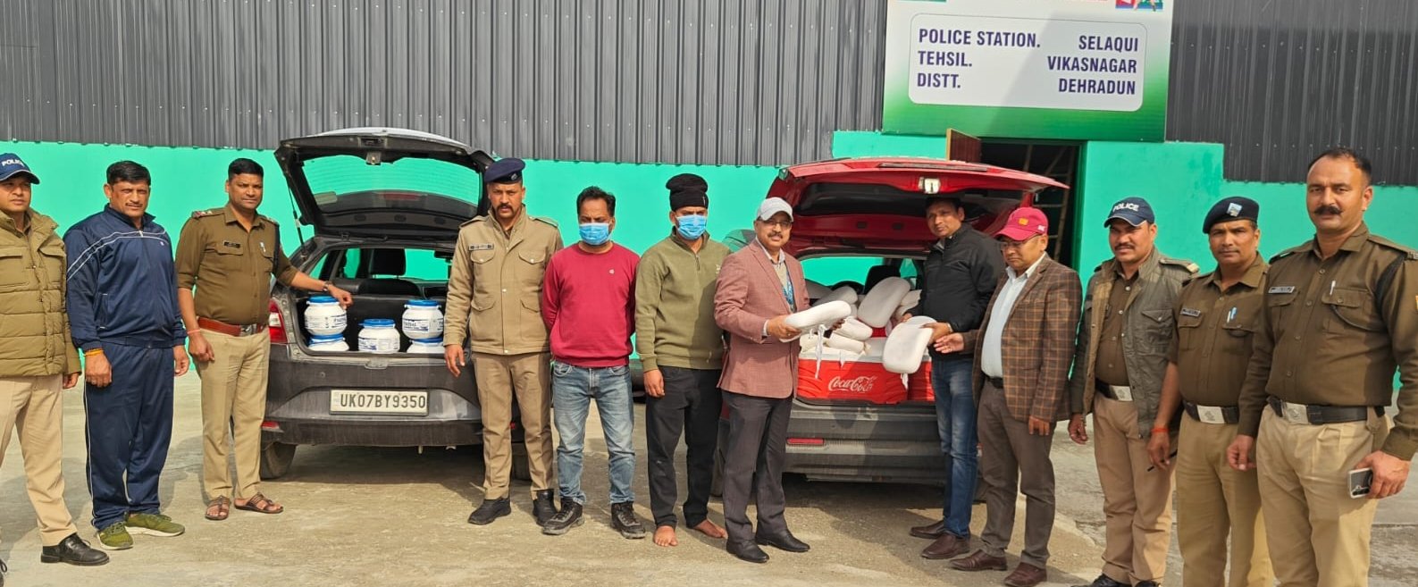 *एसएसपी देहरादून अजय सिंह* द्वारा सभी अधीनस्थों को नियमित रूप से मिलावटी खाद्य पदार्थों की कालाबाजारी तथा विक्रय में लिप्त व्यक्तियों पर लगातार सतर्क दृष्टि रखते हुए प्रभावी कार्यवाही के निर्देश दिए गए हैं। उक्त निर्देशों के क्रम में थाना सेलाकुई पुलिस द्वारा गोपनीय सूचना पर आज दिनांक 02/02/2026 को सेलाकुई बाजार में चैकिंग के दौरान माया देवी यूनिवर्सिटी के पास धूलकोट तिराहे से सेलाकुई बाजार की और तेज गति से आती हुई कार संख्या UK07FH7883 ब्रेजा लाल रंग को एवं कार संख्या UK07BY 9350 बलेनो को पुलिस टीम द्वारा रोककर चैक किया गया तो कार संख्या UK07FH7883 में तथा कार संख्या UK07BY 9350 में भारी मात्रा में पनीर व दही रखी गयी थी। जिसके सम्बन्ध में वाहन चालकों द्वारा उक्त पनीर को नकली होना बताया गया, जिस पर पुलिस टीम द्वारा वरिष्ठ खाद्य आपूर्ति अधिकारी को अवगत करते हुये उनकी टीम को मौके पर बुलाया गया जिनके द्वारा उक्त पनीर एवं दही की मौके पर सेंम्पलिंग की गयी तो उक्त पनीर एवं दही का नकली होना पाया गया। जिस पर पुलिस एवं खाद्य विभाग की टीम के द्वारा आवश्यक विधिक कार्यवाही करते हुये नकली पनीर एवं नकली दही को नष्ट किया गया। अभियुक्तों के विरूद्ध थाना सेलाकुई में सम्बन्धित धाराओं में अभियोग पंजीकृत कर दोनों वाहनों चालकों को गिरफ्तार कर उनके वाहनों को सीज किया गया।