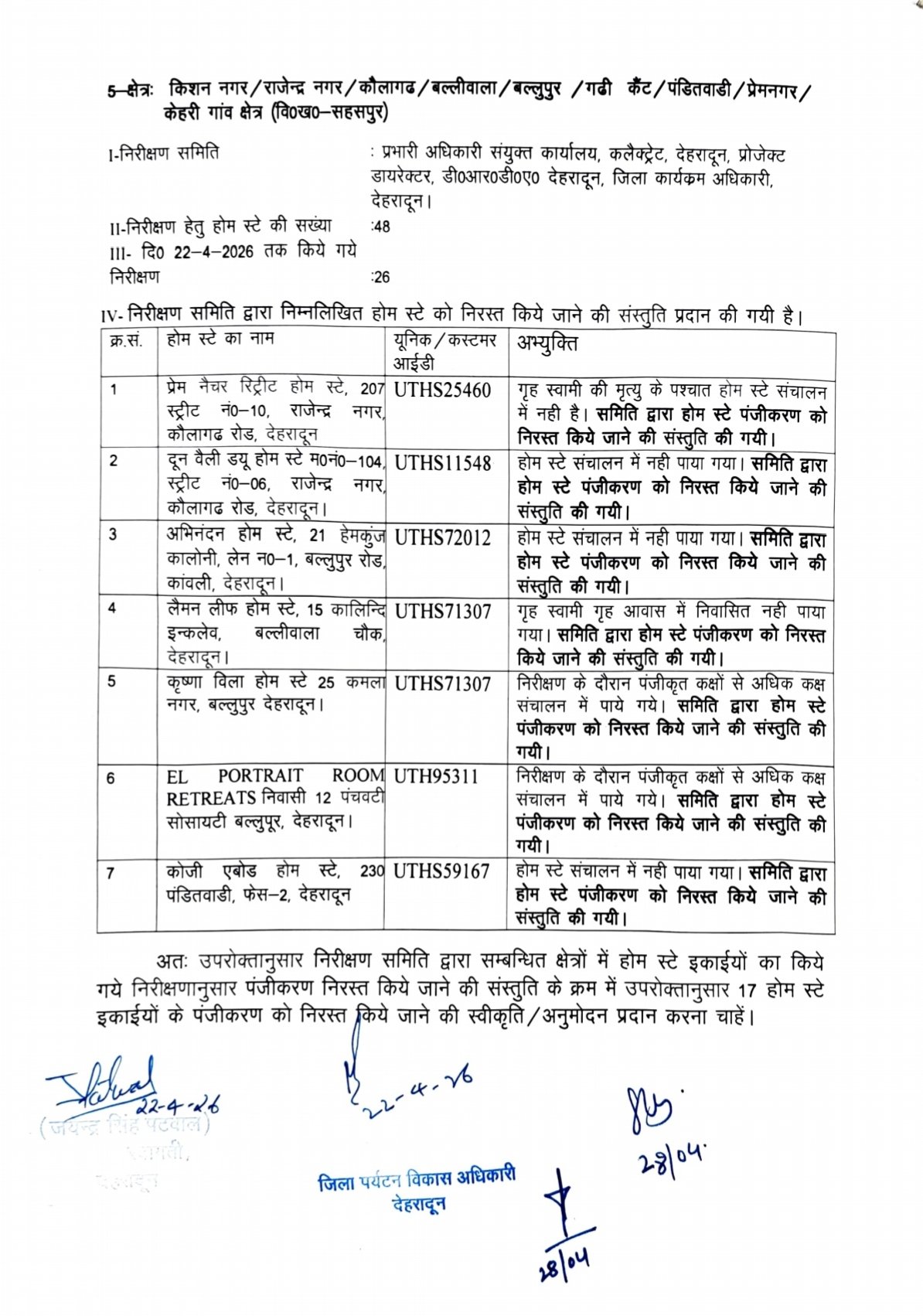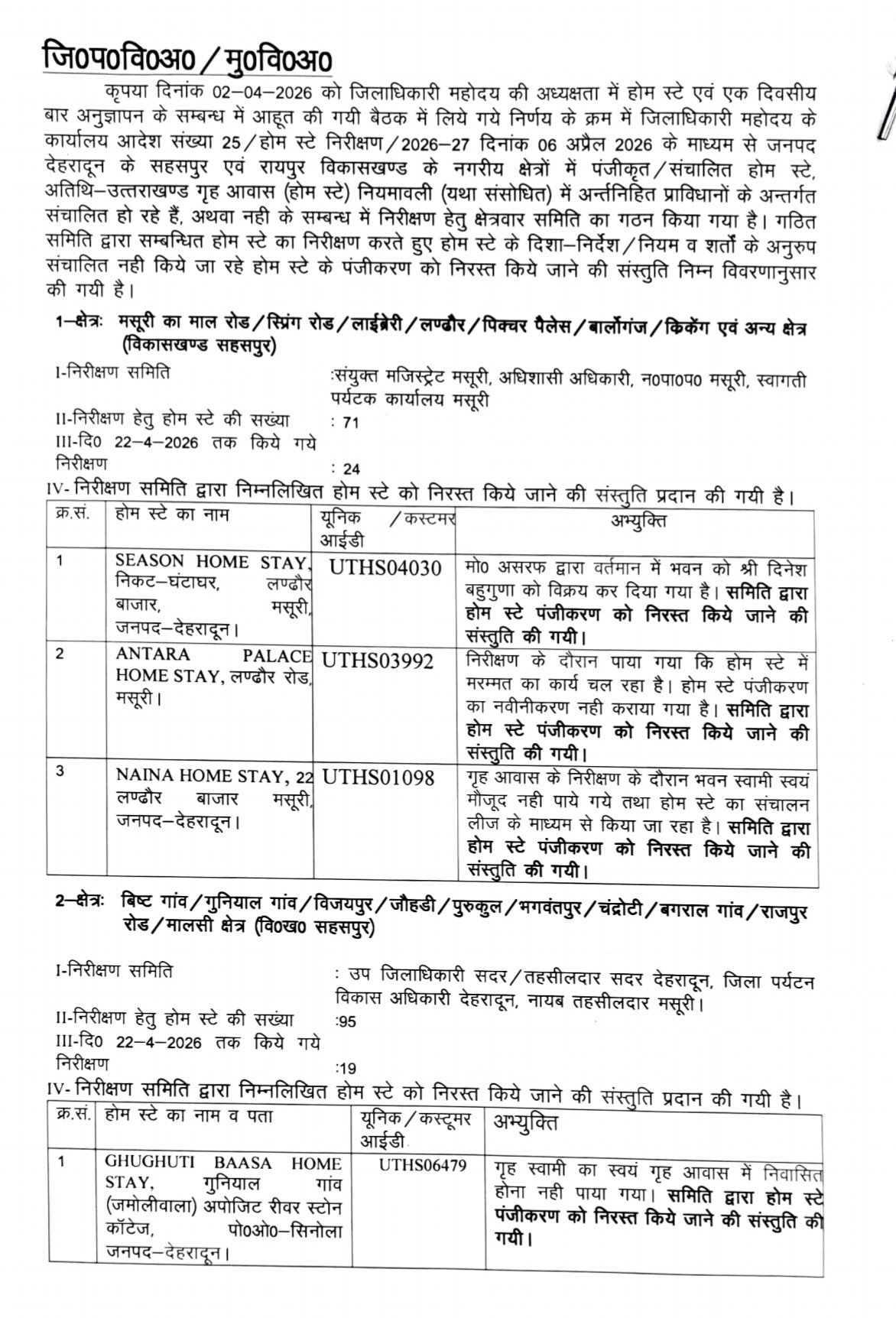 देहरादून दिनांक 29 अप्रैल 2026 (सूवि) जनपद में कानून व्यवस्था सुदृढ़ बनाए रखने तथा आमजन की सुरक्षा सुनिश्चित करने के उद्देश्य से जिलाधिकारी सविन बंसल के निर्देशानुसार होमस्टे संचालन की गहन जांच कराई जा रही है। जांच में मानकों का उल्लंघन पाए जाने पर जिला प्रशासन द्वारा बड़ी कार्रवाई करते हुए प्रथम चरण में 17 होमस्टे के पंजीकरण निरस्त कर दिए गए हैं। संबंधित होमस्टे को विभागीय वेबसाइट से भी विलोपित किया जाएगा।