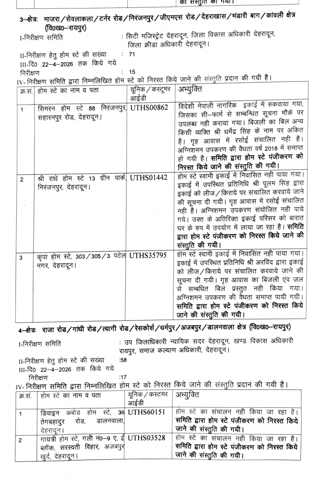 जिलाधिकारी के निर्देशानुसार सहसपुर एवं रायपुर विकासखंड के नगरीय क्षेत्रों में पंजीकृत होमस्टे की जांच हेतु क्षेत्रवार समितियों का गठन किया गया। समितियों द्वारा निरीक्षण उपरांत 17 होमस्टे ऐसे पाए गए जो उत्तराखण्ड गृह आवास (होमस्टे) नियमावली के प्रावधानों के अनुरूप संचालित नहीं हो रहे थे। इन सभी के पंजीकरण निरस्त करने की संस्तुति की गई, जिसे स्वीकार करते हुए प्रशासन द्वारा कार्रवाई की गई।