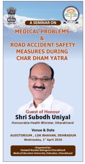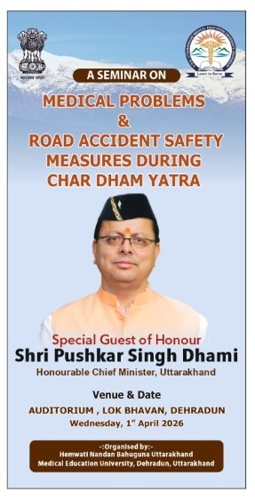 चारधाम यात्रा को सुरक्षित और व्यवस्थित बनाने की दिशा में कल बुधवार 1 अप्रैल को लोकभवन देहरादून में एक महत्वपूर्ण कार्यक्रम आयोजित किया जा रहा है। एचएनबी उत्तराखंड मेडिकल एजुकेशन यूनिवर्सिटी द्वारा “चारधाम यात्रा के दौरान मेडिकल समस्याएं एवं सड़क दुर्घटना सुरक्षा उपाय” विषय पर यह कार्यक्रम लोक भवन ऑडिटोरियम में सुबह 11 बजे से शुरू होगा। इसमें शासन, प्रशासन और चिकित्सा क्षेत्र के विशेषज्ञ एक मंच पर नजर आएंगे। कार्यक्रम में उत्तराखंड के राज्यपाल मुख्य अतिथि के रूप में शामिल होंगे। वहीं मुख्यमंत्री पुष्कर सिंह धामी और स्वास्थ्य मंत्री सुबोध उनियाल भी कार्यक्रम को संबोधित करेंगे। इस दौरान सरकार की ओर से चारधाम यात्रा को सुरक्षित और सुव्यवस्थित बनाने के लिए उठाए जा रहे कदमों की जानकारी दी जाएगी। कार्यक्रम की शुरुआत पंजीकरण प्रक्रिया से होगी। राज्यपाल के आगमन पर वंदे मातरम् और राष्ट्रगान के साथ औपचारिक शुभारंभ किया जाएगा। इसके बाद दीप प्रज्वलन किया जाएगा। विश्वविद्यालय के कुलपति प्रो. (डॉ.) भानु दुग्गल स्वागत भाषण देंगी और कार्यक्रम की रूपरेखा तथा उद्देश्यों पर विस्तार से प्रकाश डालेंगे।