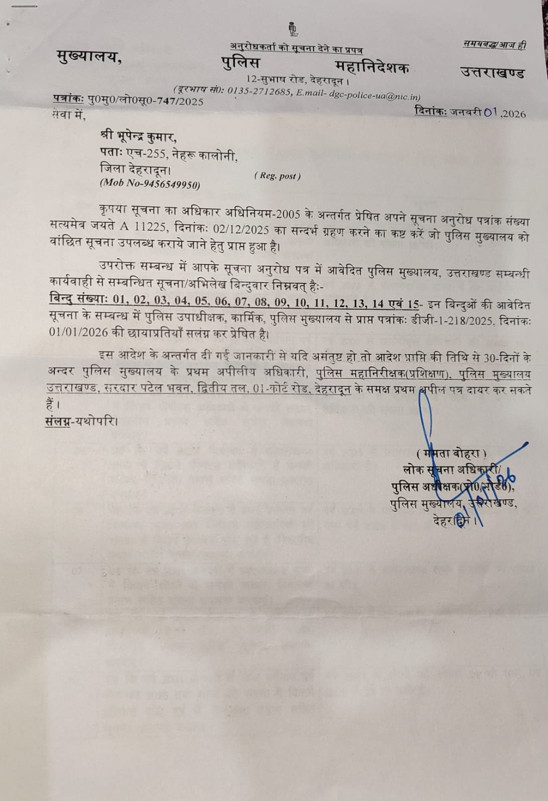 जनहित में दायर शिकायत पर कार्रवाई करते हुए उत्तराखंड मानवाधिकार आयोग के सदस्य आईपीएस राम सिंह मीना ने दिनांक: 27.01.2026 डीजीपी को नोटिस जारी कर आदेशित किया गया।