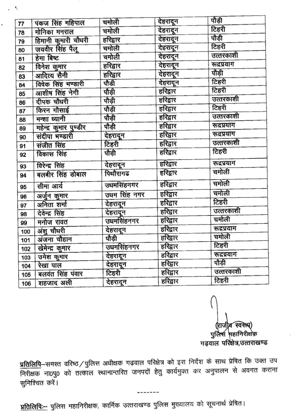 पुलिस महानिरीक्षक गढ़वाल परिक्षेत्र उत्तराखंड राजीव स्वरूप द्वारा 106 दारोगाओं के किए तबादले