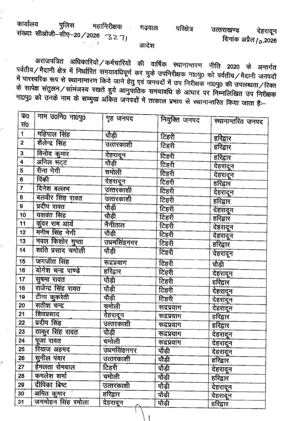 पुलिस महानिरीक्षक गढ़वाल परिक्षेत्र उत्तराखंड राजीव स्वरूप द्वारा दिनांक 10/4/2026 को गढ़वाल परिक्षेत्र के 106 दारोगाओं के स्थानांतरण आदेश जारी किए गए और गढ़वाल परिक्षेत्र के समस्त वरिष्ठ पुलिस अधीक्षक/ पुलिस अधीक्षक को निर्देशित किया गया कि उक्त उप निरीक्षक ना०पु० को तत्काल स्थानान्तरित जनपदों हेतु कार्यमुक्त कर अनुपालन से अवगत कराना सुनिश्चित करें।