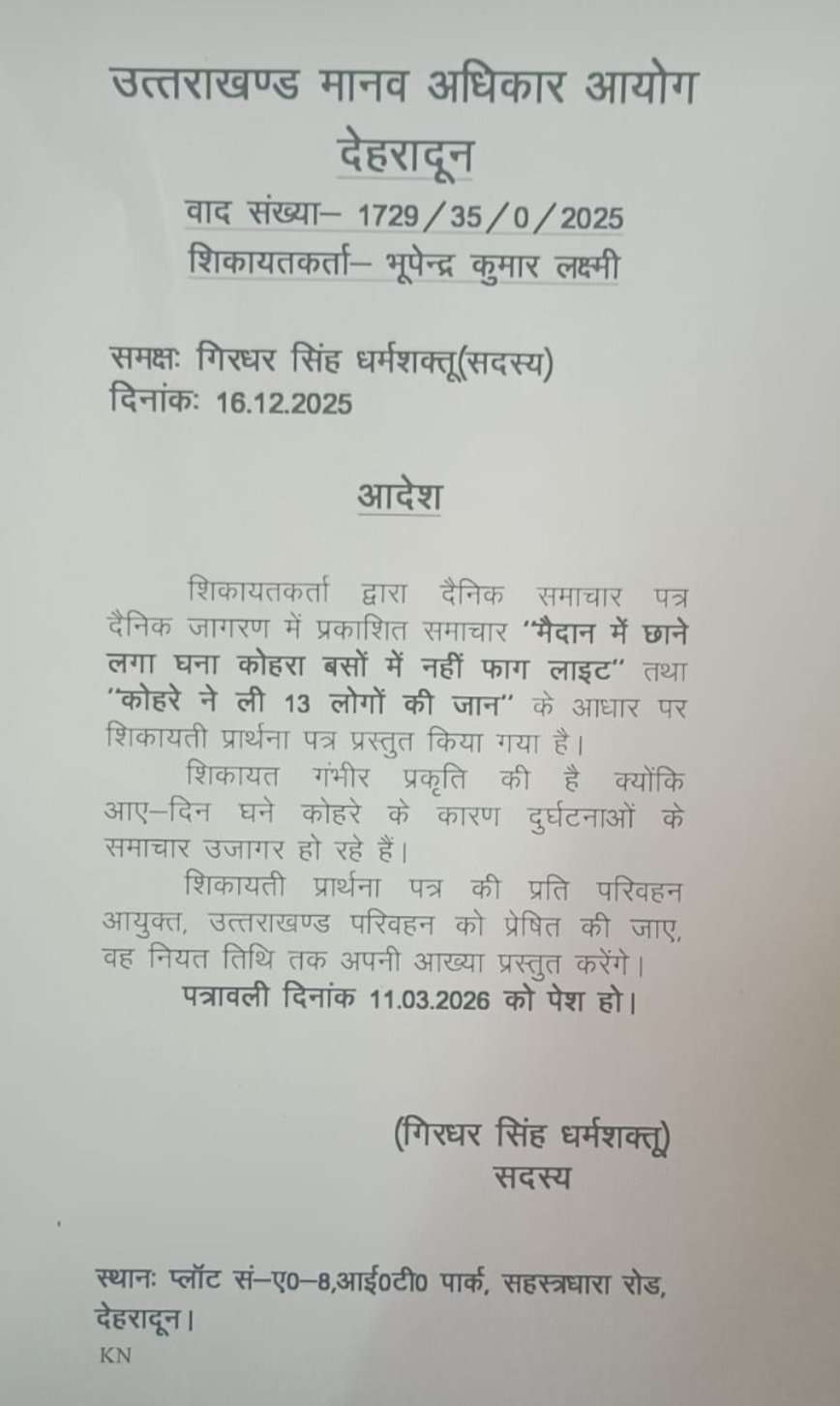 इस संवाददाता द्वारा उपरोक्त मामले में दिनांक 15/12/2025 को मानवाधिकार आयोग उत्तराखंड में जनहित याचिका दायर कर निवेदन किया गया कि “अत्यधिक सर्द मौसम की शुरुआत हो चुकी है,मैदानी इलाकों में घना कोहरा छाने लगा है, परंतु उत्तराखंड परिवहन निगम (रोडवेज) की अधिकतर बसों में फाग लाइटें नहीं हैं,इससे दुर्घटना का खतरा बना है,जिस कारण बसों में सफर करना जान को जोखिम में डालने जैसा है।