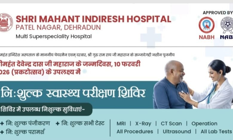 देहरादून:दरबार श्री गुरु राम राय जी महाराज के सज्जादे गद्दी नशीन एवं पूजनीय श्रीमहंत देवेन्द्र दास जी महाराज के जन्मदिवस (प्रकटोत्सव 10 फरवरी) के पावन अवसर पर श्री महंत इन्दिरेश अस्पताल, देहरादून द्वारा 10 फरवरी 2026 (मंगलवार) को एक विशाल निःशुल्क स्वास्थ्य परीक्षण शिविर का आयोजन किया जा रहा है, जिसे इस वर्ष सेवा दिवस के रूप में श्रद्धा, सेवा और समर्पण की भावना के साथ मनाया जाएगा। इस शिविर में जनरल चिकित्सा सेवाओं के साथ-साथ सभी सुपरस्पेशलिटी सेवाएं भी पूर्णतः निःशुल्क उपलब्ध कराई जाएंगी। शिविर के लिए पंजीकरण सुबह 08 बजे से प्रारंभ होगा, जबकि मरीज सुबह 09 बजे से दोपहर 03 बजे तक स्वास्थ्य सेवाओं का लाभ ले सकेंगे।