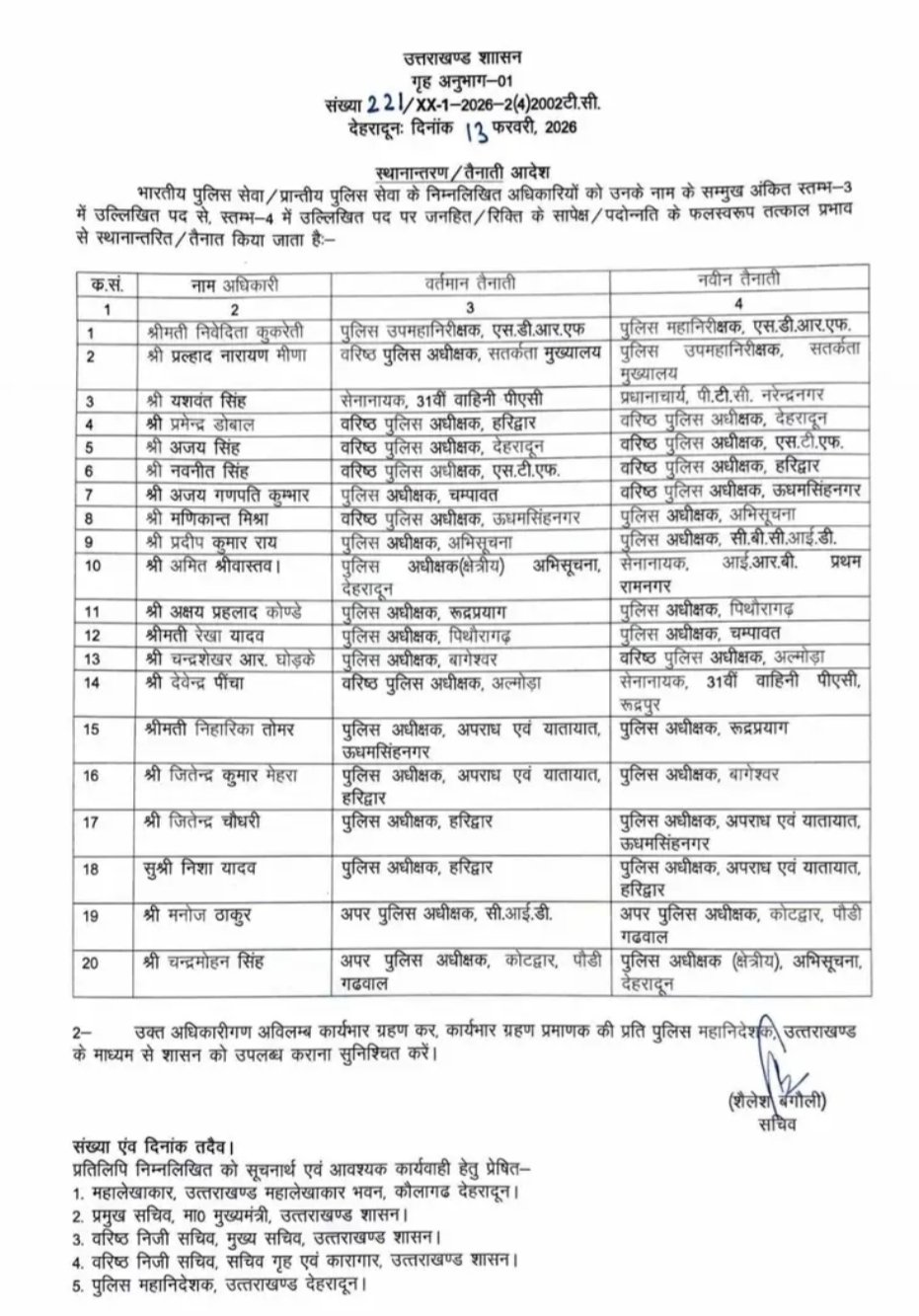 उत्तराखंड शासन ने शुक्रवार को पुलिस विभाग में बड़ा प्रशासनिक फेरबदल करते हुए 20 भारतीय पुलिस सेवा (IPS) एवं प्रांतीय पुलिस सेवा (PPS) अधिकारियों के स्थानांतरण/तैनाती आदेश जारी किए हैं। जारी आदेश के अनुसार अधिकारियों को तत्काल प्रभाव से नई जिम्मेदारियां सौंपी गई हैं।