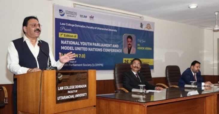 देहरादून 24 अप्रैल:उत्तरांचल विश्वविद्यालय के लाॅ काॅलेज देहरादून में आज काॅलेज की 7वीं राष्ट्रीय माॅडल यूनाइटेड नेशन काॅन्फ्रेंस का भव्य शुभारम्भ किया गया। 2 दिन चलने वाली इस काॅन्फ्रेंस में 300 से अधिक युवा सांसदों ने भागीदारी की। उत्तराखण्ड अन्य पिछड़ा वर्ग परिषद के उपाध्यक्ष अशोक वर्मा इस अवसर पर बतौर मुख्य अतिथि उपस्थित थे।