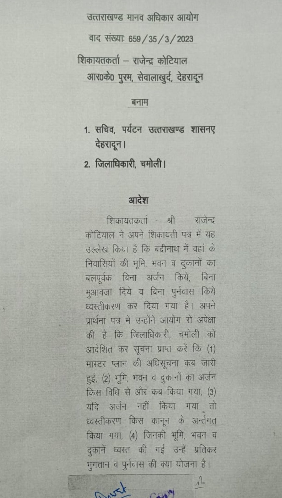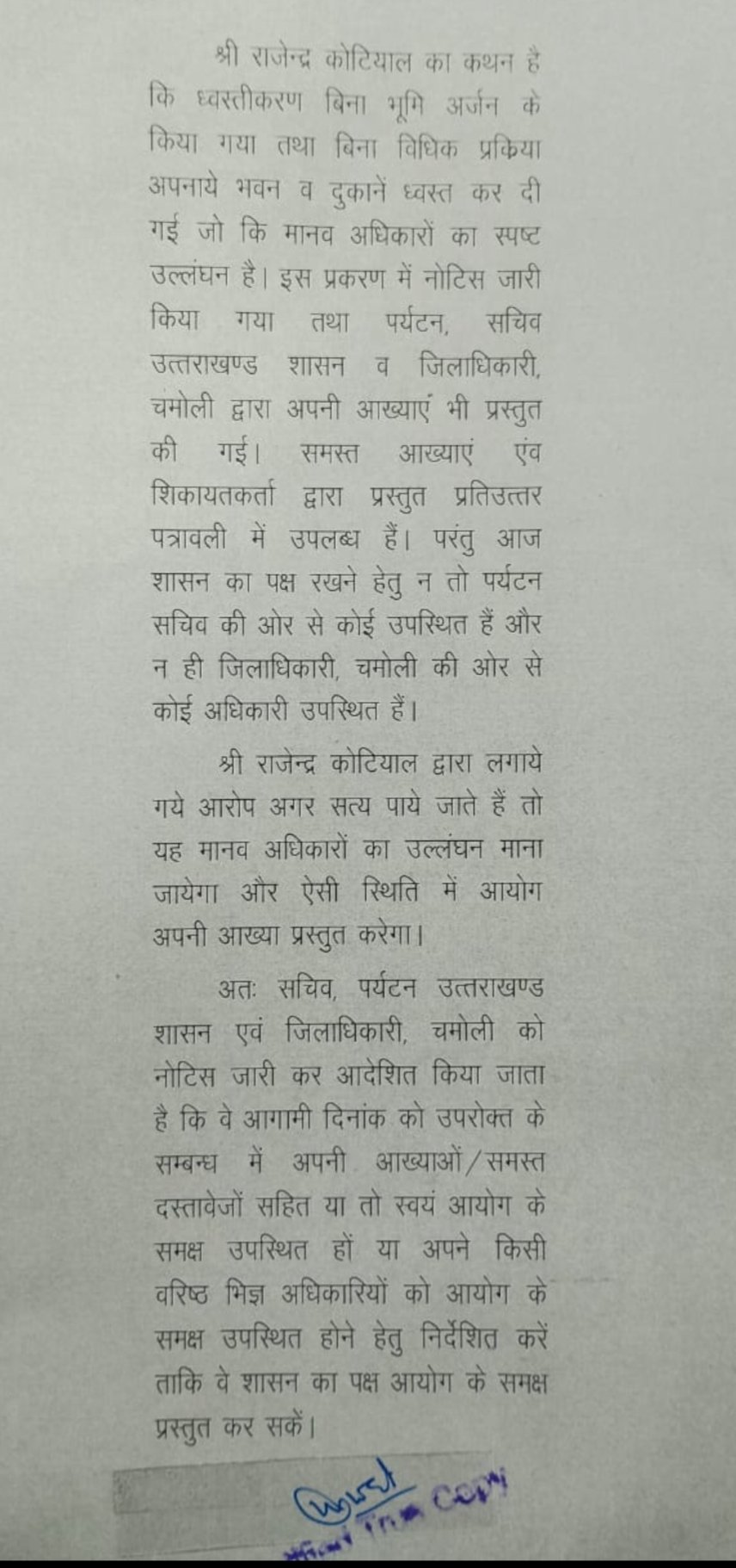 राजेन्द्र कोटियाल का कथन है कि ध्वस्तीकरण बिना भूमि अर्जन के किया गया तथा बिना विधिक प्रक्रिया अपनाये भवन व दुकानें ध्वस्त कर दी गई जो कि मानव अधिकारों का स्पष्ट उल्लंघन है। इस प्रकरण में नोटिस जारी किया गया तथा पर्यटन, सचिव उत्तराखण्ड शासन व जिलाधिकारी, चमोली द्वारा अपनी आख्याएं भी प्रस्तुत की गई। समस्त आख्याएं एंव शिकायतकर्ता द्वारा प्रस्तुत प्रतिउत्तर पत्रावली में उपलब्ध हैं। परंतु आज शासन का पक्ष रखने हेतु न तो पर्यटन सचिव की ओर से कोई उपस्थित हैं और न ही जिलाधिकारी, चमोली की ओर से कोई अधिकारी उपस्थित हैं।