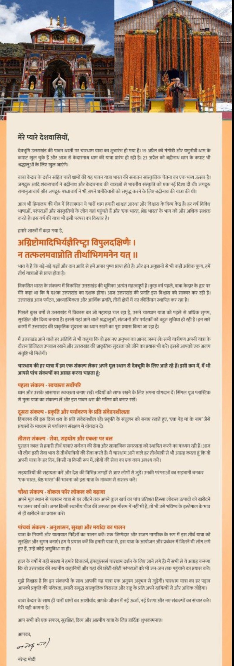 प्रधानमंत्री नरेंद्र मोदी ने चारधाम यात्रा शुरु होने पर देशवासियों को शुभकामना संदेश देते हुए, उत्तराखंड आने वाले तीर्थयात्रियों से पांच संकल्पों का पालन करने का आग्रह किया है।