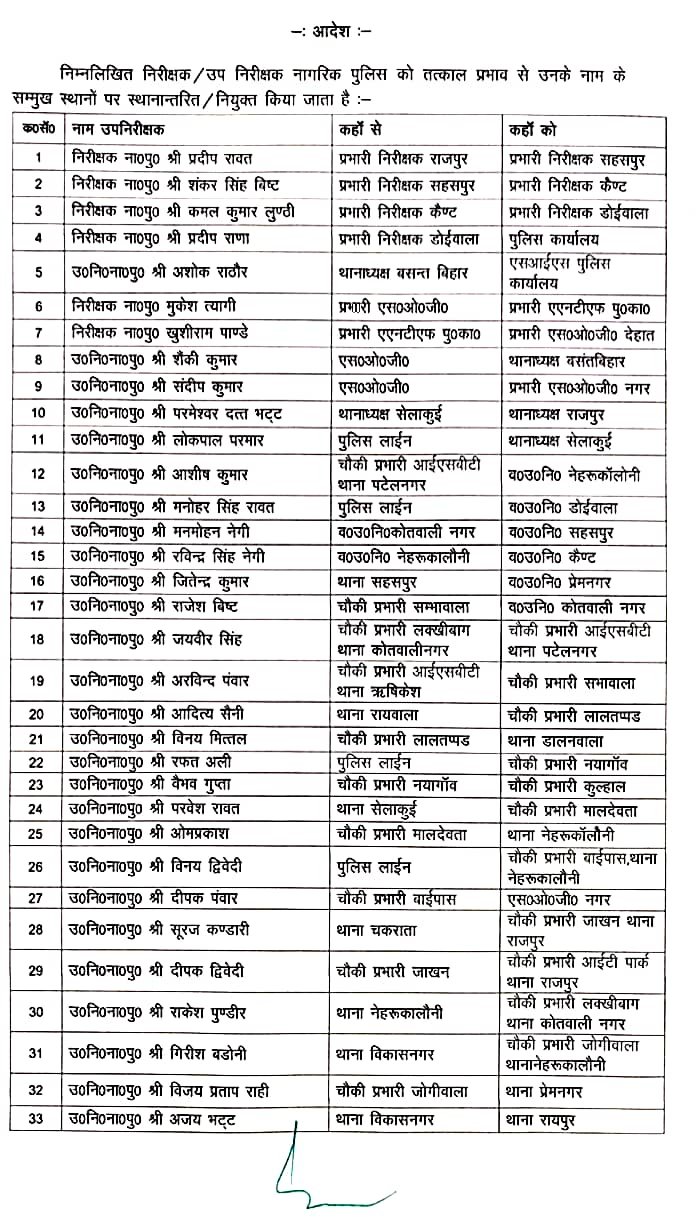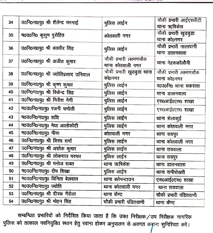 वरिष्ठ पुलिस अधीक्षक देहरादून प्रमेन्द्र सिंह डोबाल निम्न 54 निरीक्षकों/उप निरीक्षकों के किए गए ट्रांसफर-