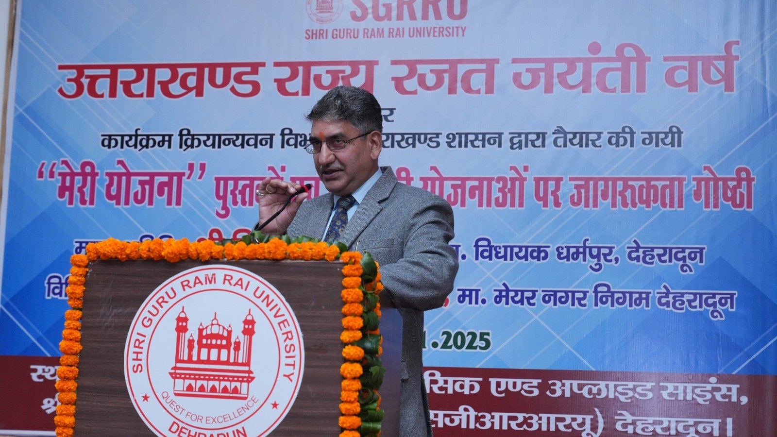 देहरादून:उत्तराखण्ड राज्य स्थापना दिवस के अवसर पर शुक्रवार को श्री गुरु राम राय विश्वविद्यालय में एक विशेष कार्यक्रम का आयोजन किया गया। कार्यक्रम क्रियान्वयन विभाग, उत्तराखण्ड शासन द्वारा “मेरी योजना” पुस्तकों के सम्बन्ध में एक जागरूकता गोष्ठी आयोजित की गई। इस गोष्ठी का उद्देश्य विद्यार्थियों एवं नागरिकों को राज्य व केन्द्र सरकार की योजनाओं की जानकारी देना था।