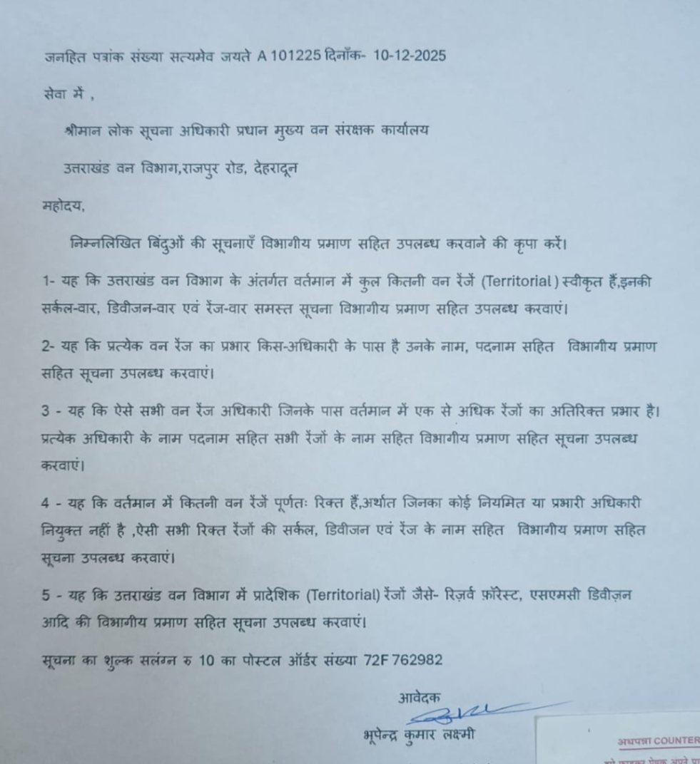 प्रधान मुख्य वन संरक्षक कार्यालय, उत्तराखंड वन विभाग, राजपुर रोड देहरादून के लोक सूचना अधिकारी को विधिवत रूप से भेजे गए आरटीआई आवेदन में विभाग की प्रादेशिक (Territorial) वन रेंजों से संबंधित अत्यंत महत्वपूर्ण और सार्वजनिक महत्व की जानकारियां मांगी गई थीं। इसके अंतर्गत राज्य में स्वीकृत कुल वन रेंजों की संख्या, सर्कल-वार व डिवीजन-वार विवरण, प्रत्येक रेंज के प्रभारी अधिकारियों के नाम-पदनाम, एक से अधिक रेंजों का अतिरिक्त प्रभार संभाल रहे अधिकारियों की सूची, पूर्णतः रिक्त रेंजों की जानकारी तथा रिज़र्व फ़ॉरेस्ट एवं एसएमसी डिवीज़न जैसी प्रादेशिक संरचनाओं का विवरण शामिल था।
